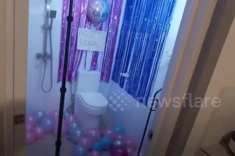 He dyed the water in the toilet tank, and decorated the bathroom with pink and blue balloons.